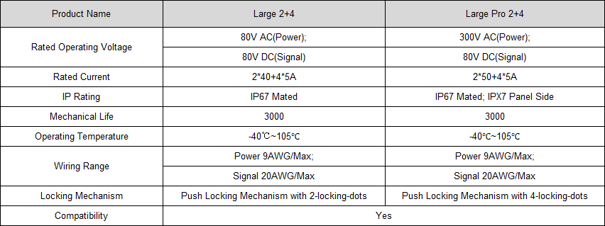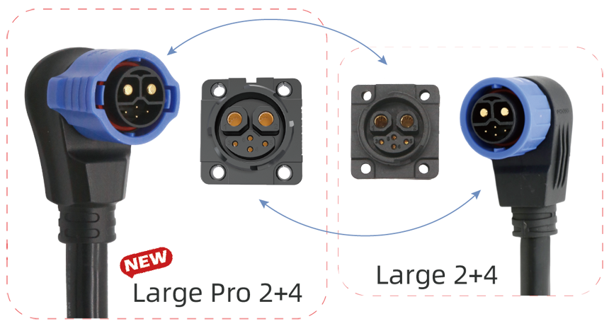 Large Pro 2+4 以卓越性能為核心,滿足電動兩輪和三輪車在(zài)複雜路況和多樣天氣條件(jiàn)下的高功率、安(ān)全、穩定的電力傳輸的嚴苛需求。該產品支持高達300V 的電壓和 50A 的電流容量,具備高可靠性、以(yǐ)用戶為中心(xīn)的產品易用性,並完美兼容現有Large2+4係列。