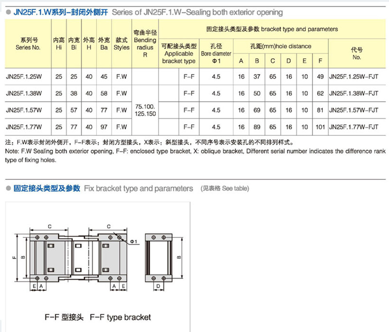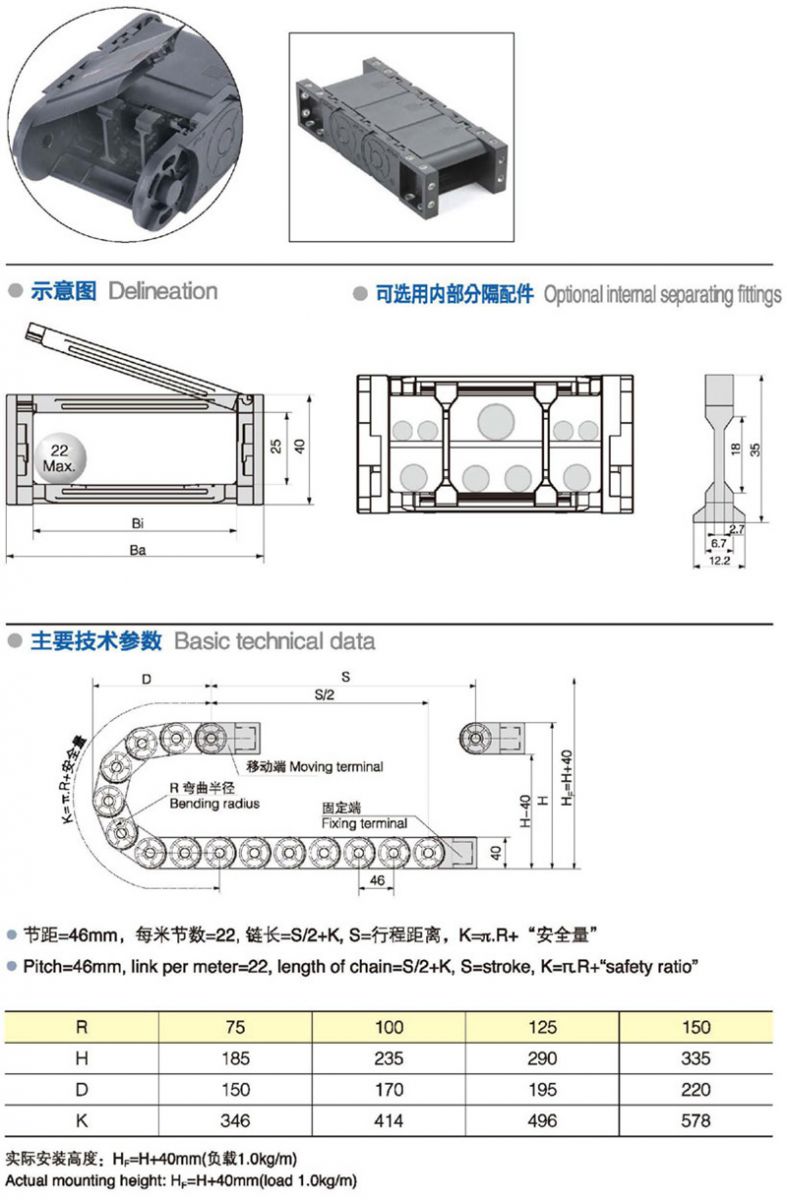名稱:拖鏈 材質:塑料 係列號:JN25F.1.W 長度:22pitch/m內高:25mm 內寬:25-77mm 彎曲半徑:75100125150 應用機械:全部